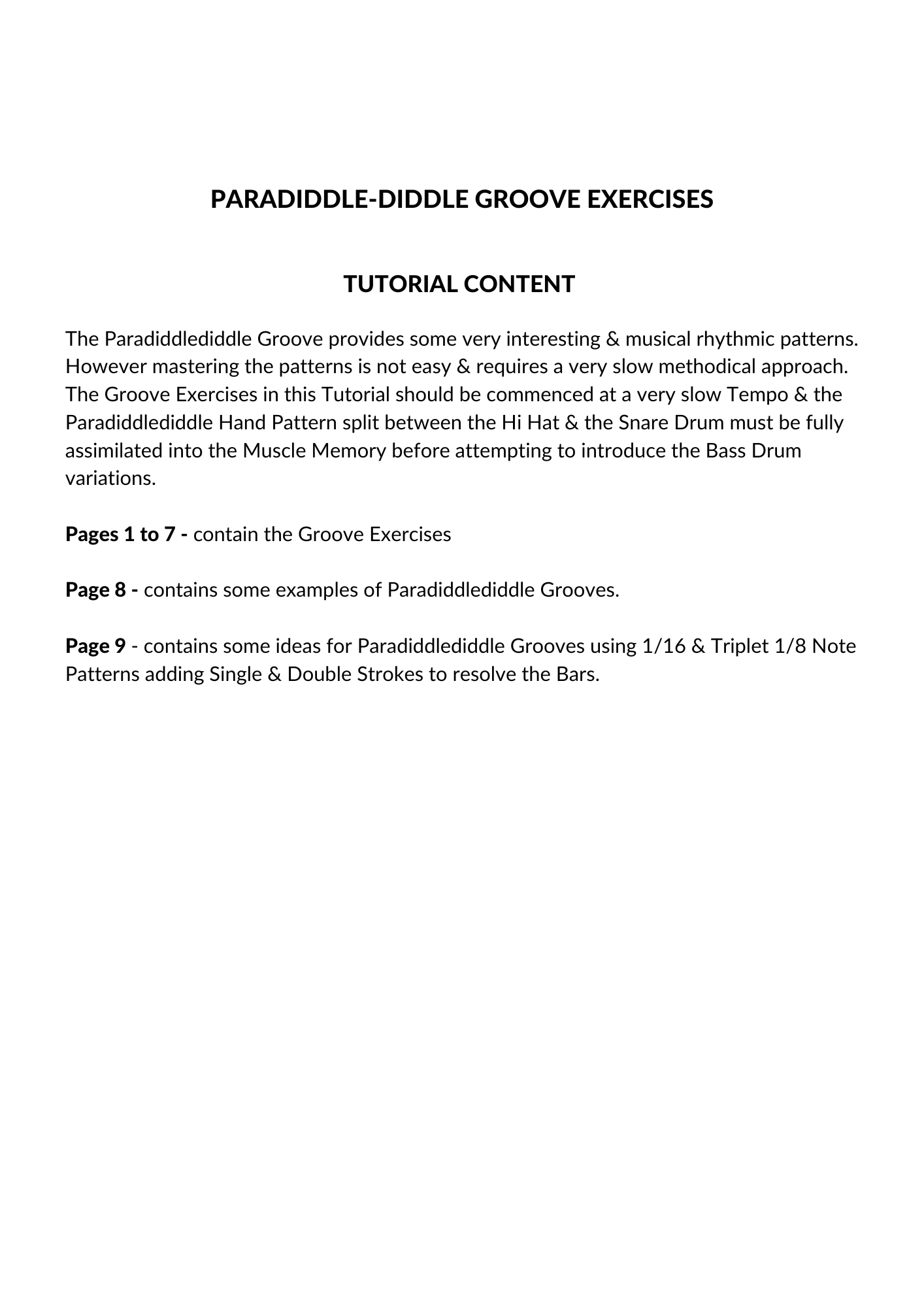 The 9 page Groove Exercises in this Tutorial should be commenced at a very slow Tempo & the Paradiddlediddle Hand Pattern split between the Hi Hat & the Snare Drum must be fully assimilated into the Muscle Memory before attempting to introduce the Bass Drum variations.